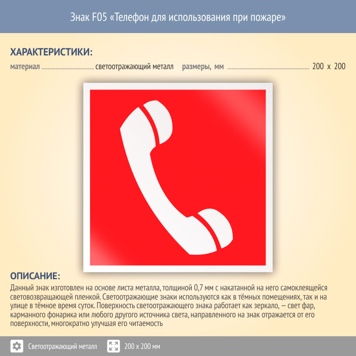 Знак F05 «Телефон для использования при пожаре (в том числе телефон прямой связи с пожарной охраной)» (светоотражающий металл, 200х200 мм) в Кызыле купить