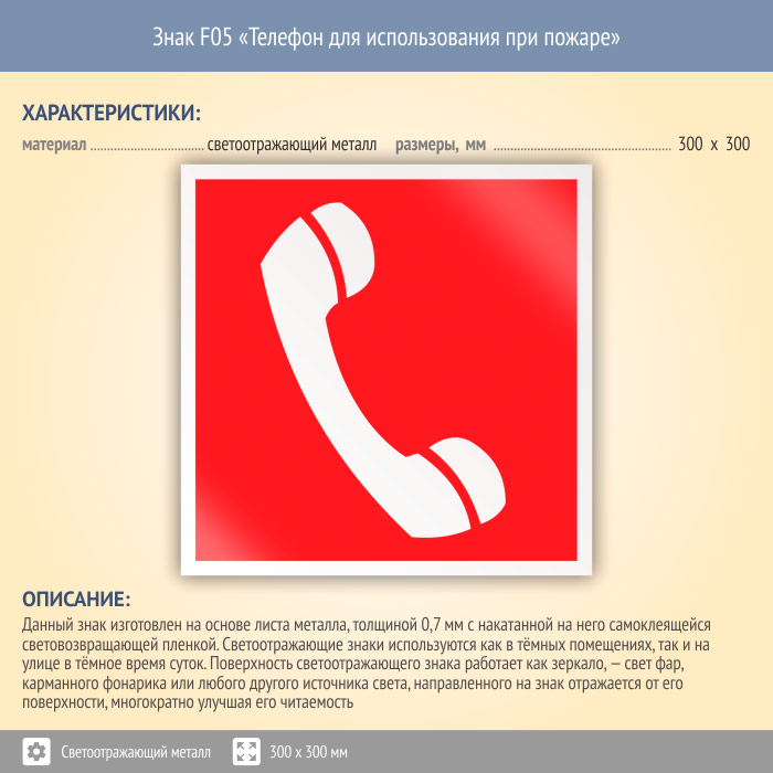 Знак F05 «Телефон для использования при пожаре (в том числе телефон прямой связи с пожарной охраной)» (светоотражающий металл, 300х300 мм) в Кызыле купить