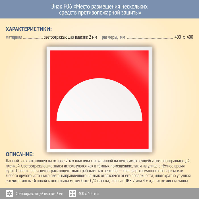 Знак F06 «Место размещения нескольких средств противопожарной защиты» (светоотражающий пластик, 400х400 мм) в Кызыле купить