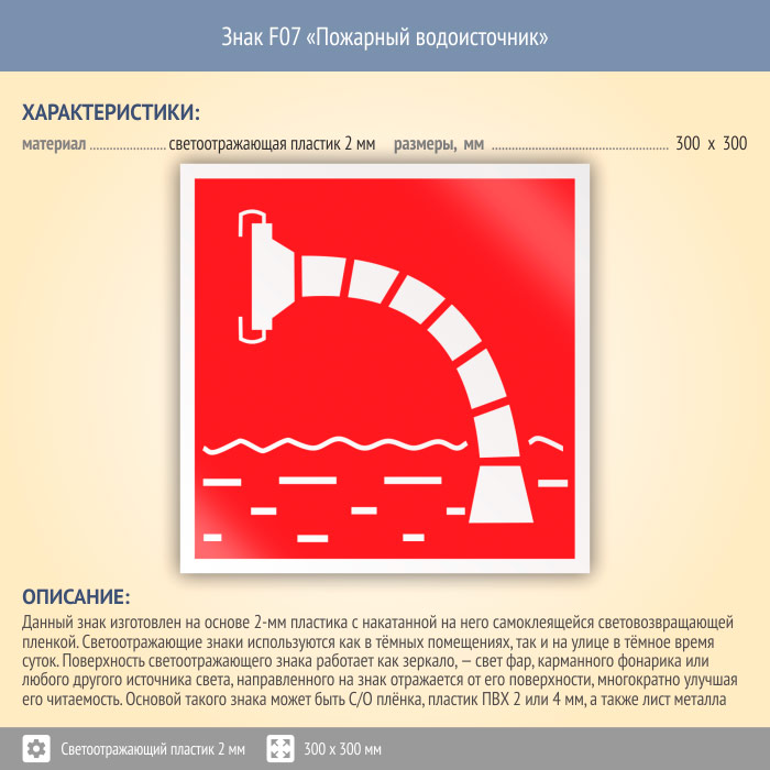 Знак F07 «Пожарный водоисточник» (светоотражающий пластик, 300х300 мм) в Кызыле купить