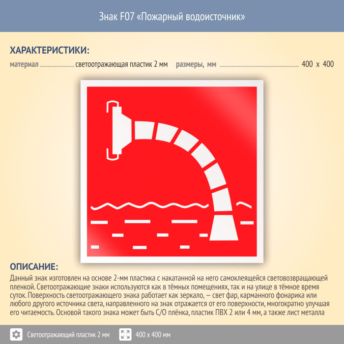 Знак F07 «Пожарный водоисточник» (светоотражающий пластик, 400х400 мм) в Кызыле купить