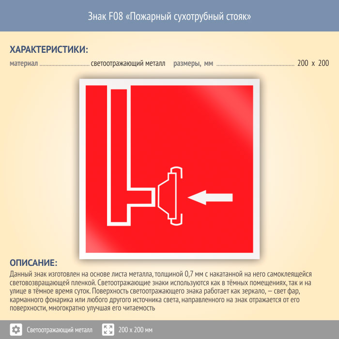 Знак F08 «Пожарный сухотрубный стояк» (светоотражающий металл, 200х200 мм) в Кызыле купить