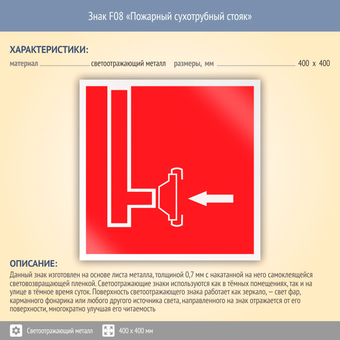 Знак F08 «Пожарный сухотрубный стояк» (светоотражающий металл, 400х400 мм) в Кызыле купить