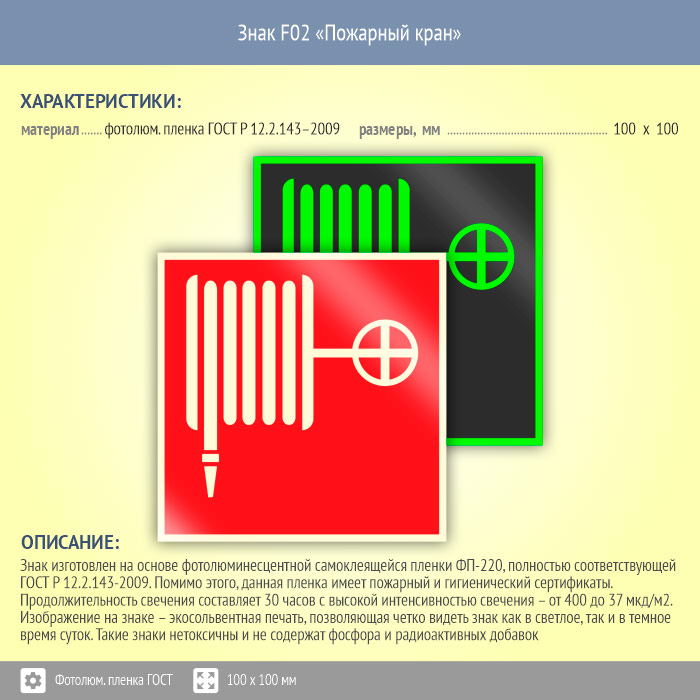 Знак F02 «Пожарный кран» (фотолюминесцентная пленка ГОСТ 34428-2018, 100х100 мм) в Кызыле купить