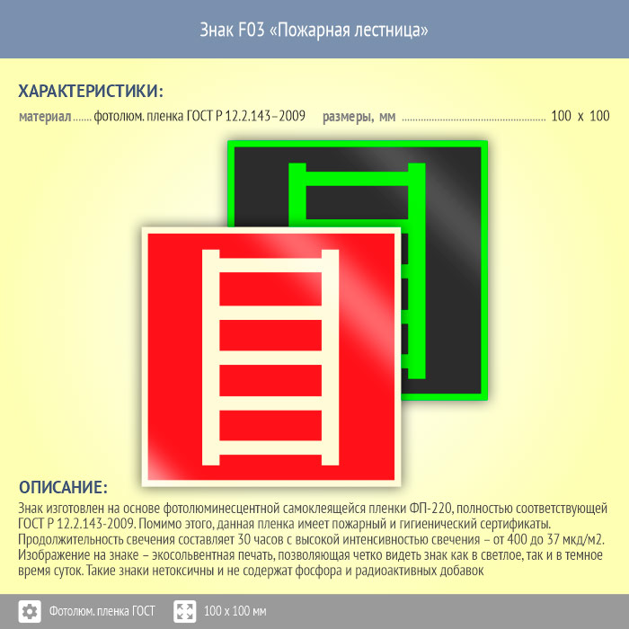 Знак F03 «Пожарная лестница» (фотолюминесцентная пленка ГОСТ 34428-2018, 100х100 мм) в Кызыле купить