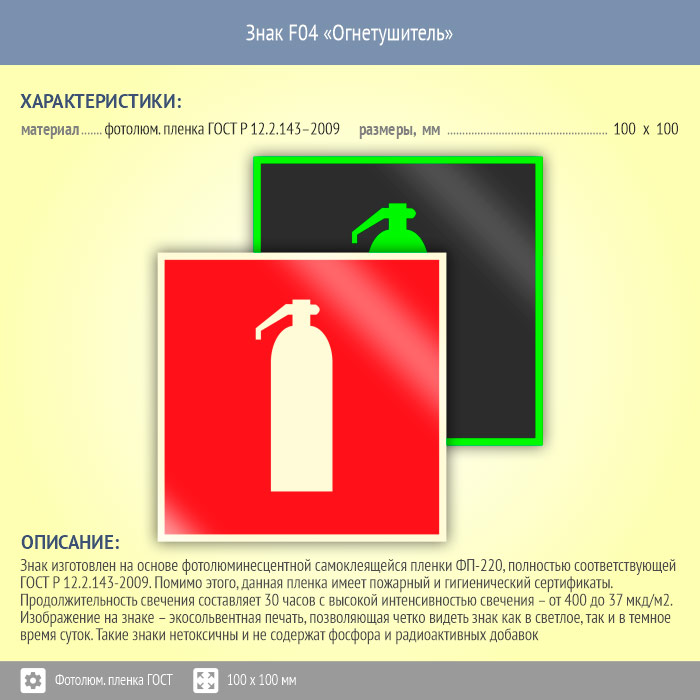 Знак F04 «Огнетушитель» (фотолюминесцентная пленка ГОСТ 34428-2018, 100х100 мм) в Кызыле купить