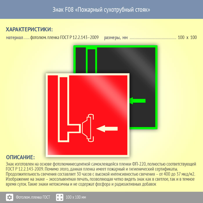 Знак F08 «Пожарный сухотрубный стояк» (фотолюминесцентная пленка ГОСТ 34428-2018, 100х100 мм) в Кызыле купить