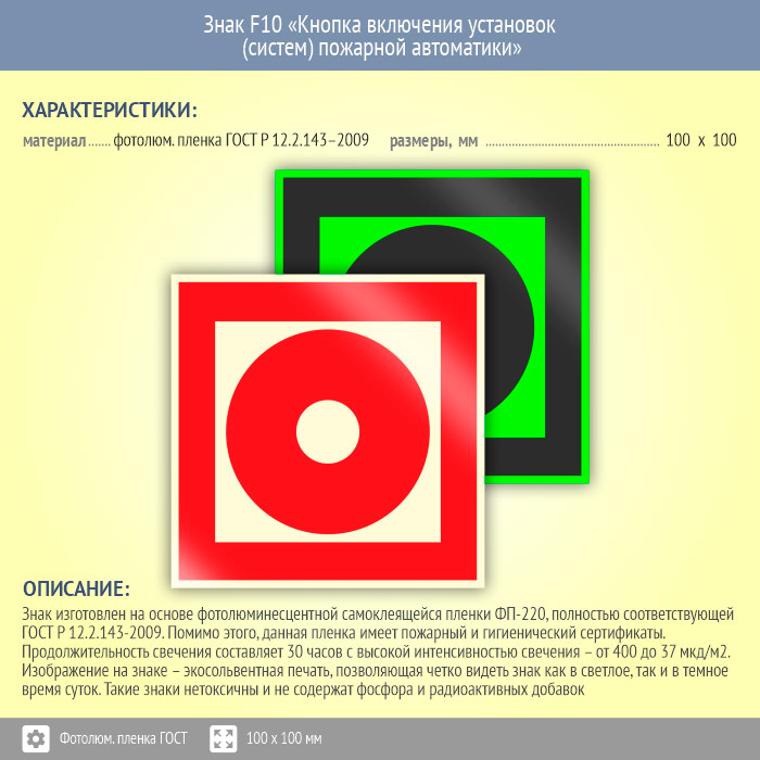 Знак F10 «Кнопка включения установок (систем) пожарной автоматики» (фотолюминесцентная пленка ГОСТ 34428-2018, 100х100 мм) в Кызыле купить