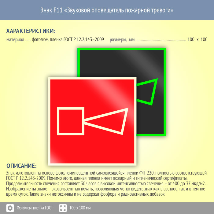 Знак F11 «Звуковой оповещатель пожарной тревоги» (фотолюминесцентная пленка ГОСТ 34428-2018, 100х100 мм) в Кызыле купить