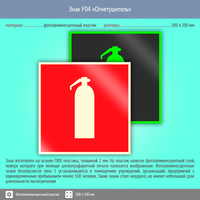 Знак F04 «Огнетушитель» (фотолюминесцентный пластик, 200х200 мм) в Кызыле купить