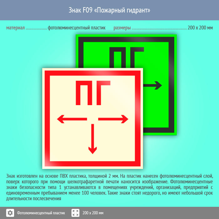 Знак F09 «Пожарный гидрант» (фотолюминесцентный пластик, 200х200 мм) в Кызыле купить