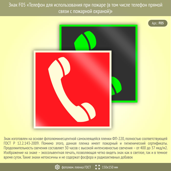 Знак F05 «Телефон для использования при пожаре (в том числе телефон прямой связи с пожарной охраной)» (фотолюминесцентная пленка ГОСТ 34428-2018, 150х150 мм) в Кызыле купить