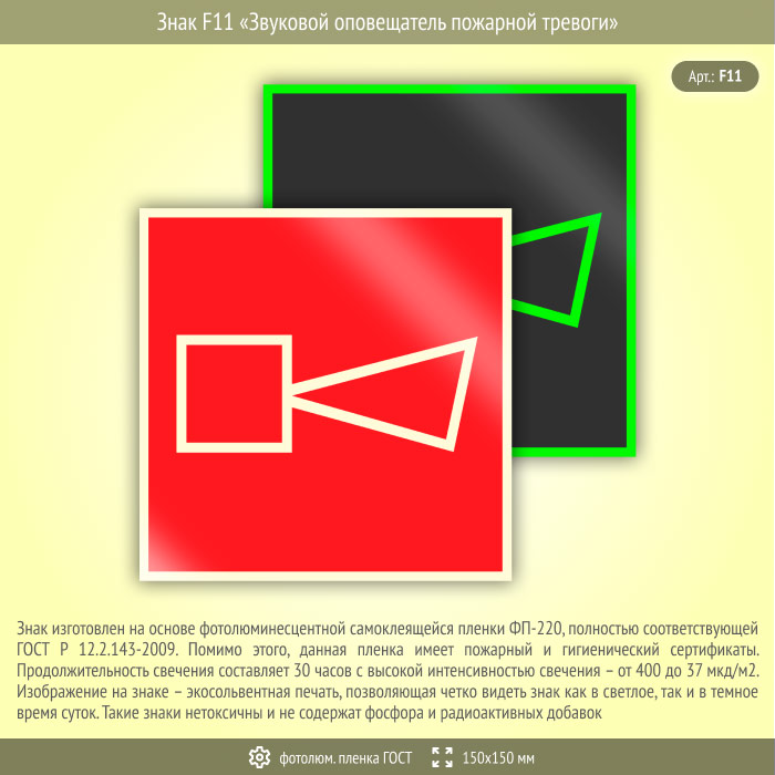 Знак F11 «Звуковой оповещатель пожарной тревоги» (фотолюминесцентная пленка ГОСТ 34428-2018, 150х150 мм) в Кызыле купить