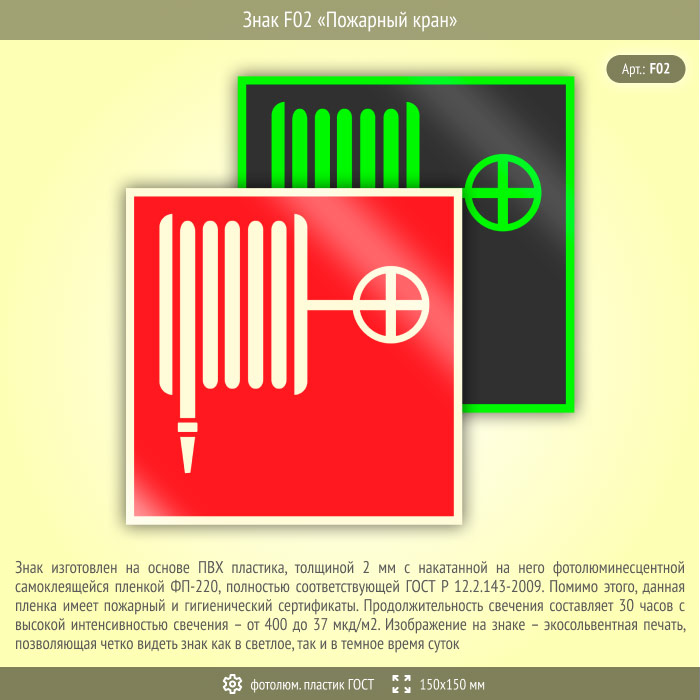 Знак F02 «Пожарный кран» (фотолюминесцентный пластик ГОСТ 34428-2018, 150х150 мм) в Кызыле купить