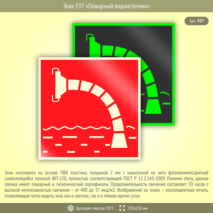 Знак F07 «Пожарный водоисточник» (фотолюминесцентный пластик ГОСТ 34428-2018, 150х150 мм) в Кызыле купить
