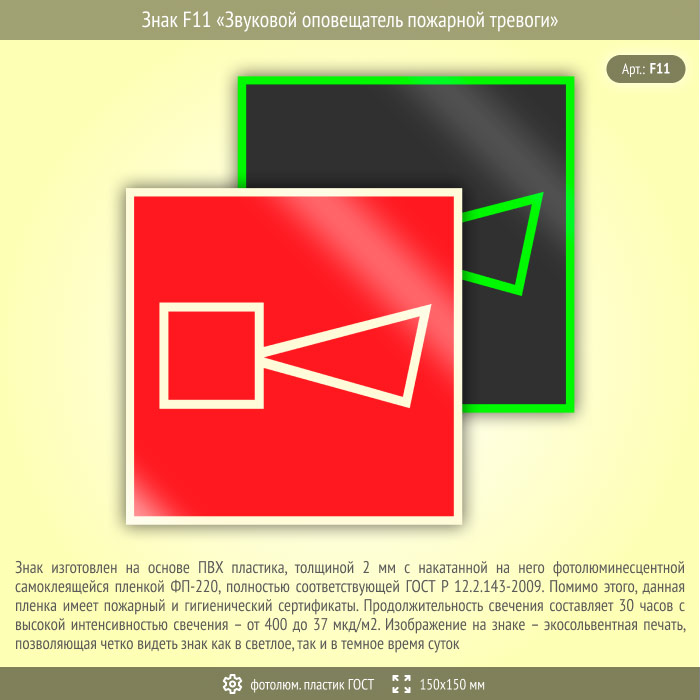 Знак F11 «Звуковой оповещатель пожарной тревоги» (фотолюминесцентный пластик ГОСТ 34428-2018, 150х150 мм) в Кызыле купить