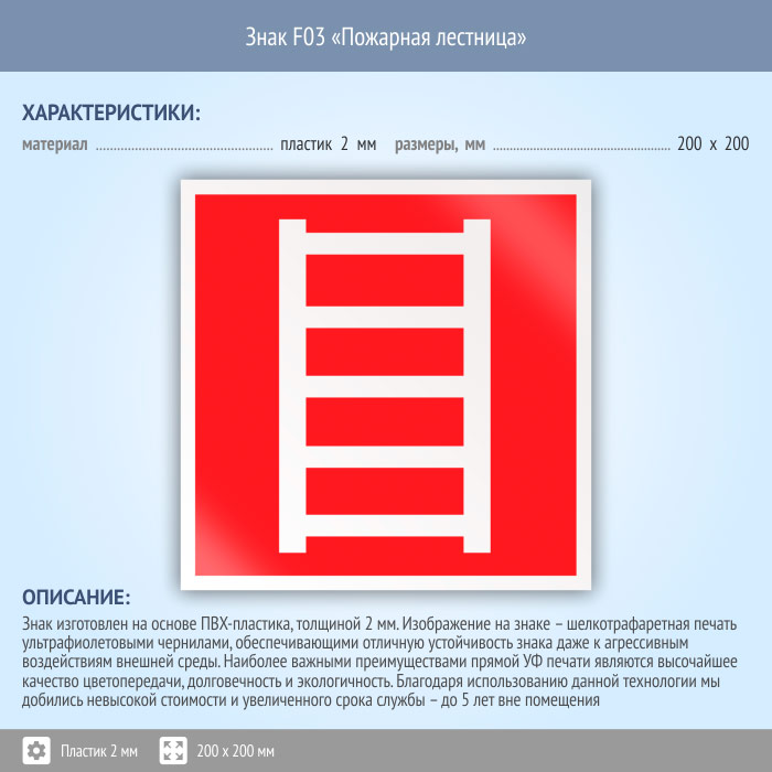 Знак F03 «Пожарная лестница» (пластик, 200х200 мм) в Кызыле купить