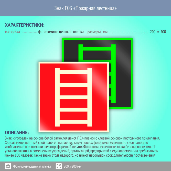 Знак F03 «Пожарная лестница» (фотолюминесцентная пленка, 200х200 мм) в Кызыле купить