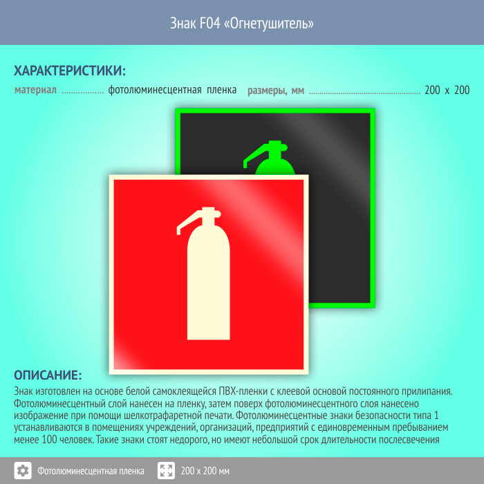 Знак F04 «Огнетушитель» (фотолюминесцентная пленка, 200х200 мм) в Кызыле купить