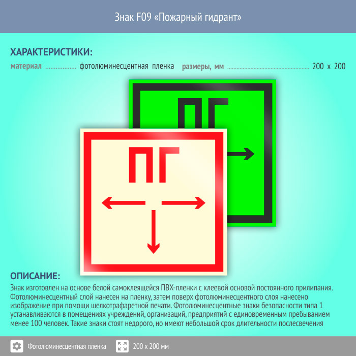 Знак F09 «Пожарный гидрант» (фотолюминесцентная пленка, 200х200 мм) в Кызыле купить