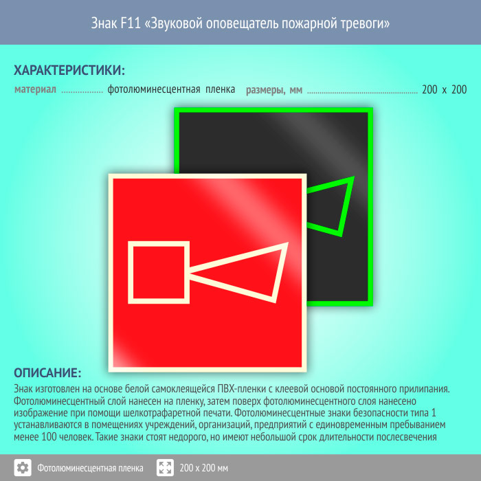 Знак F11 «Звуковой оповещатель пожарной тревоги» (фотолюминесцентная пленка, 200х200 мм) в Кызыле купить