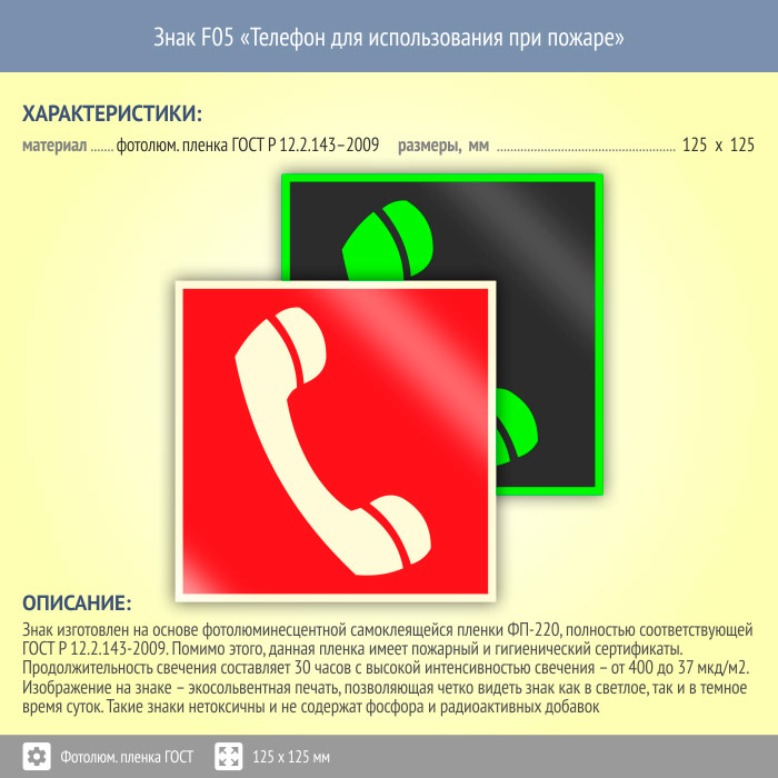 Знак F05 «Телефон для использования при пожаре (в том числе телефон прямой связи с пожарной охраной)» (фотолюминесцентная пленка ГОСТ 34428-2018, 125х125 мм) в Кызыле купить