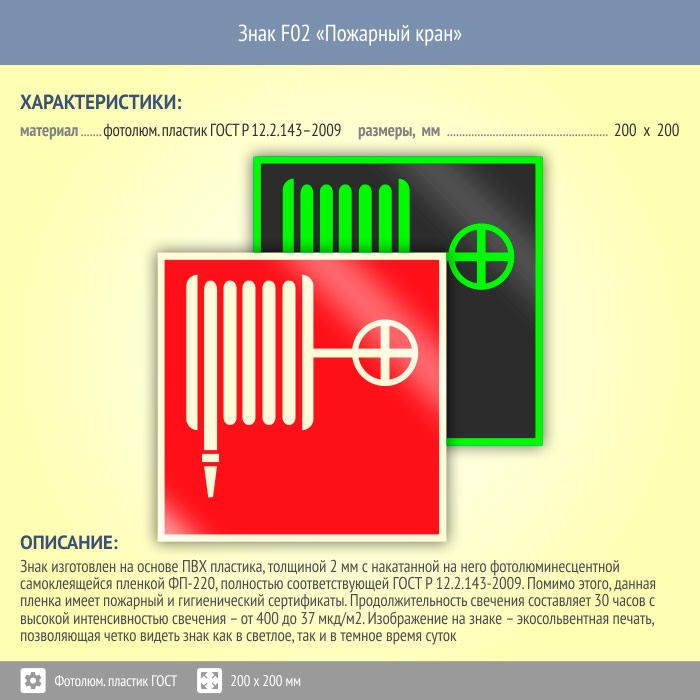 Знак F02 «Пожарный кран» (фотолюминесцентный пластик ГОСТ 34428-2018, 200х200 мм) в Кызыле купить