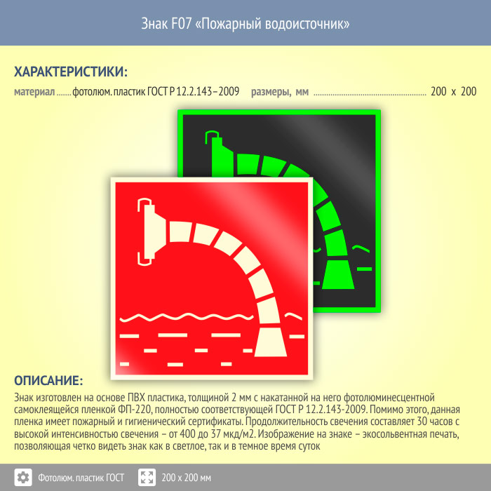 Знак F07 «Пожарный водоисточник» (фотолюминесцентный пластик ГОСТ 34428-2018, 200х200 мм) в Кызыле купить