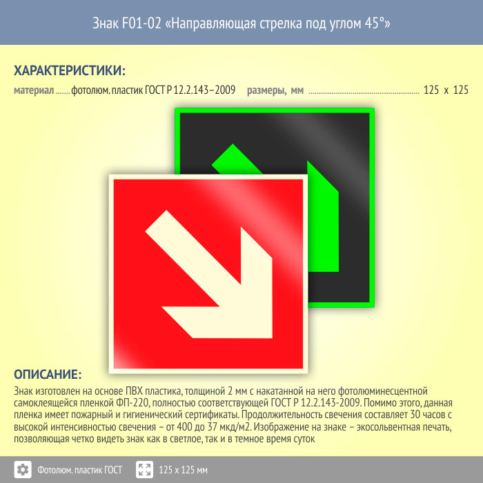 Знак F01-02 «Направляющая стрелка под углом 45°» (фотолюминесцентный пластик ГОСТ 34428-2018, 125х125 мм) в Кызыле купить