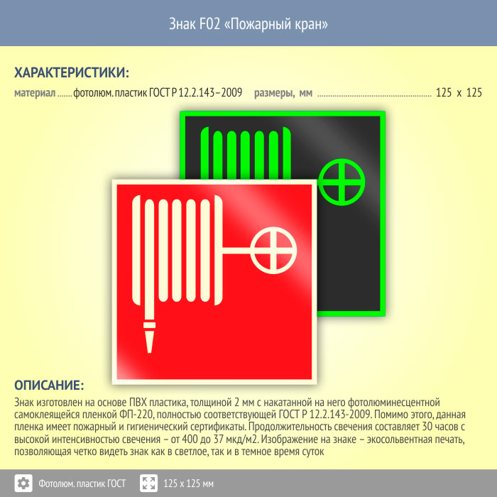 Знак F02 «Пожарный кран» (фотолюминесцентный пластик ГОСТ 34428-2018, 125х125 мм) в Кызыле купить