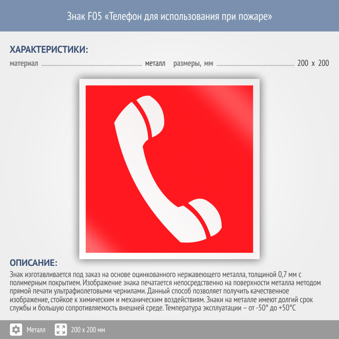 Знак F05 «Телефон для использования при пожаре (в том числе телефон прямой связи с пожарной охраной)» (металл, 200х200 мм) в Кызыле купить