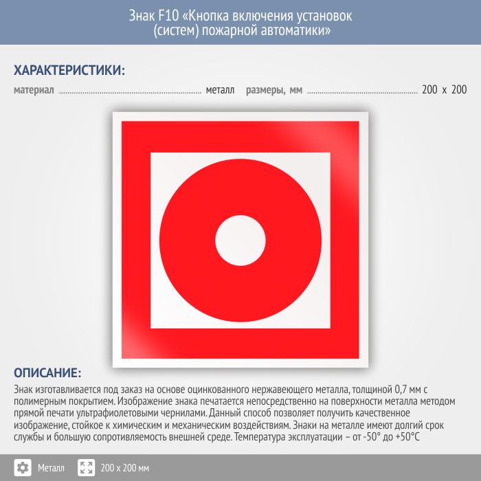 Знак F10 «Кнопка включения установок (систем) пожарной автоматики» (металл, 200х200 мм) в Кызыле купить